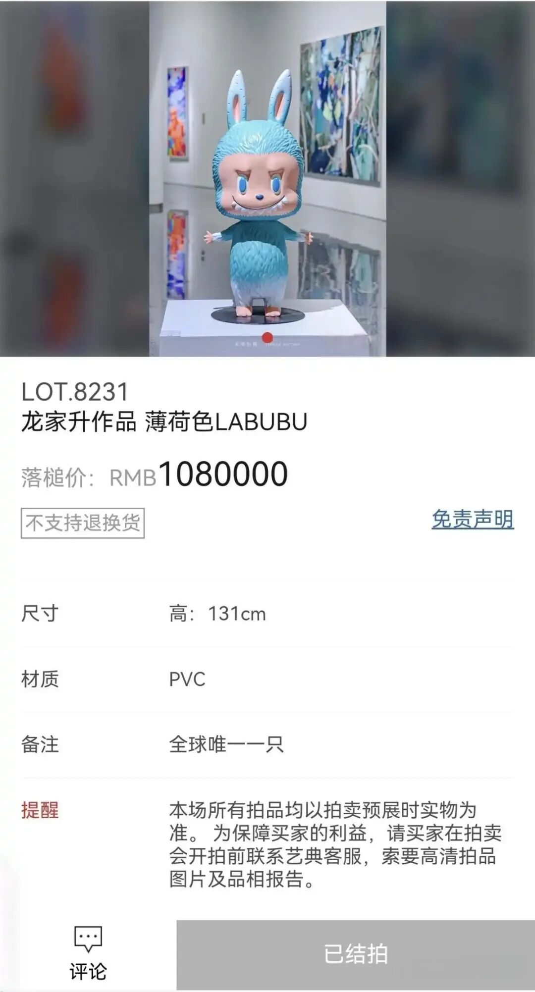 - 疯狂竞价:全球孤品 131 厘米薄荷绿 LABUBU,经线上买家激烈争夺,以 108 万落槌(含佣金 124.2 万),刷新潮玩拍卖纪录;